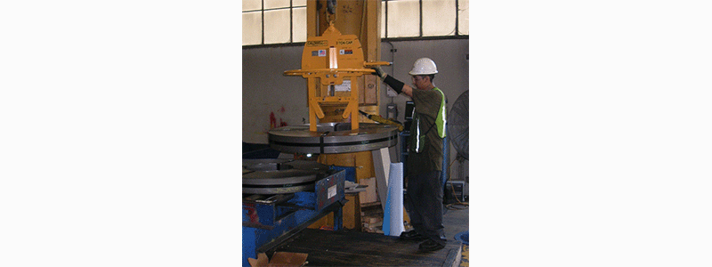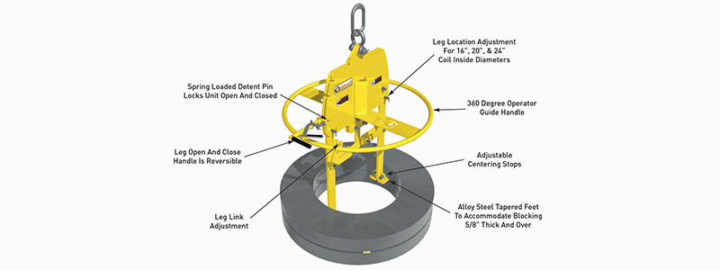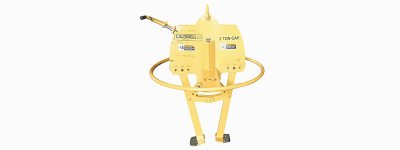The New Model 83E Ergonomic Vertical Eye Coil Lifter is and efficient way to handle vertically stacked coils with ID’s of 16”, 20” and 24”. The lifter is easy to actuate with a spring loaded ergonomic style grip lever and 360º operator guide handle. The standard oblong lifting eye is designed to fit a wide range of crane hooks. The lifting feet are designed to accommodate 5/8” blocking! As with all Caldwell Strong-Bac lifters, the model 83E Ergonomic Vertical Eye Coil Lifter is designed and manufactured to ASME B30.20 BTH-1, category B, service class 2.