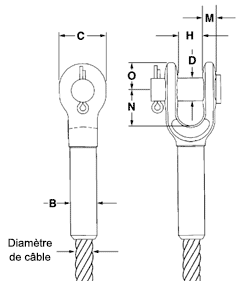 | Taille câble pouce | AS max. B | C | D | H | M | N | O | LB chaque |