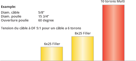 Note: La CAPACITÉ maximale, LA CHARGE MAXIMALE D’UTILISATION (CMU) ou LA TRACTION LINÉAIRE du câble est généralement 1/5 des valeurs trouvées ci-dessous. Pour des informations spécifiques veuillez consulter les standards qui s’appliquent à l’utilisation de votre câble.