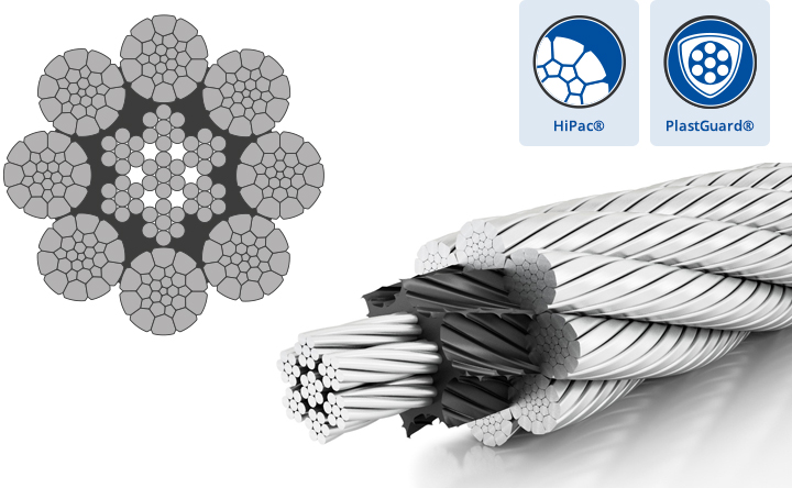 Câble d’acier à 8 torons à haute performance pour ponts roulants et levage à flèche avec âme enrobée de plastique. Ce plastique dur, spécialement conçu évite le contact de métal contre métal entre les torons intérieurs et extérieurs et réduit fortement l’usure interne indiscernable ainsi que l’abrasion, ce qui a pour conséquence d’accroître la résistance à la fatigue et de permettre une lubrification constante de l’âme.